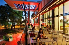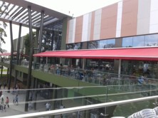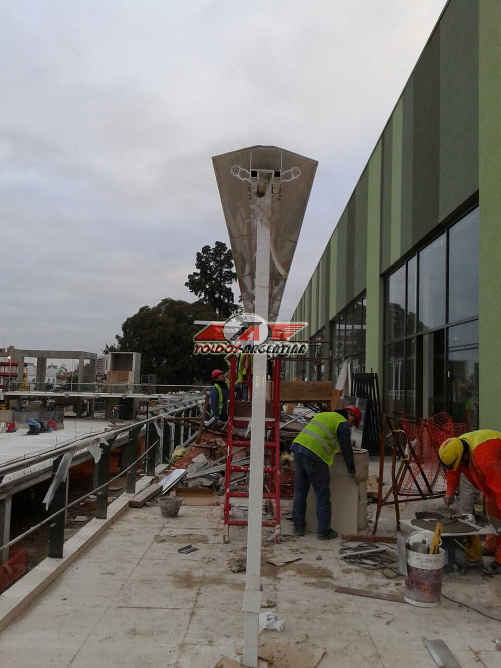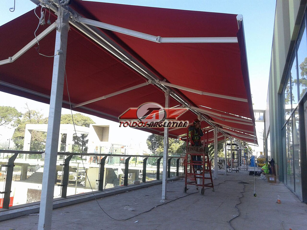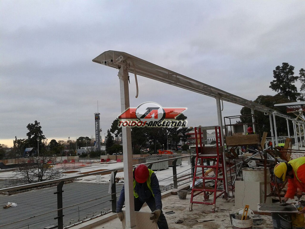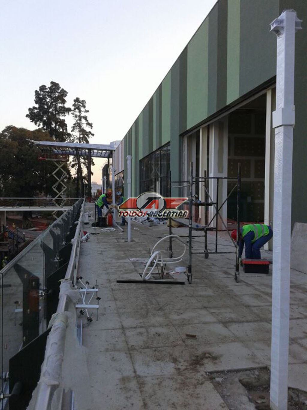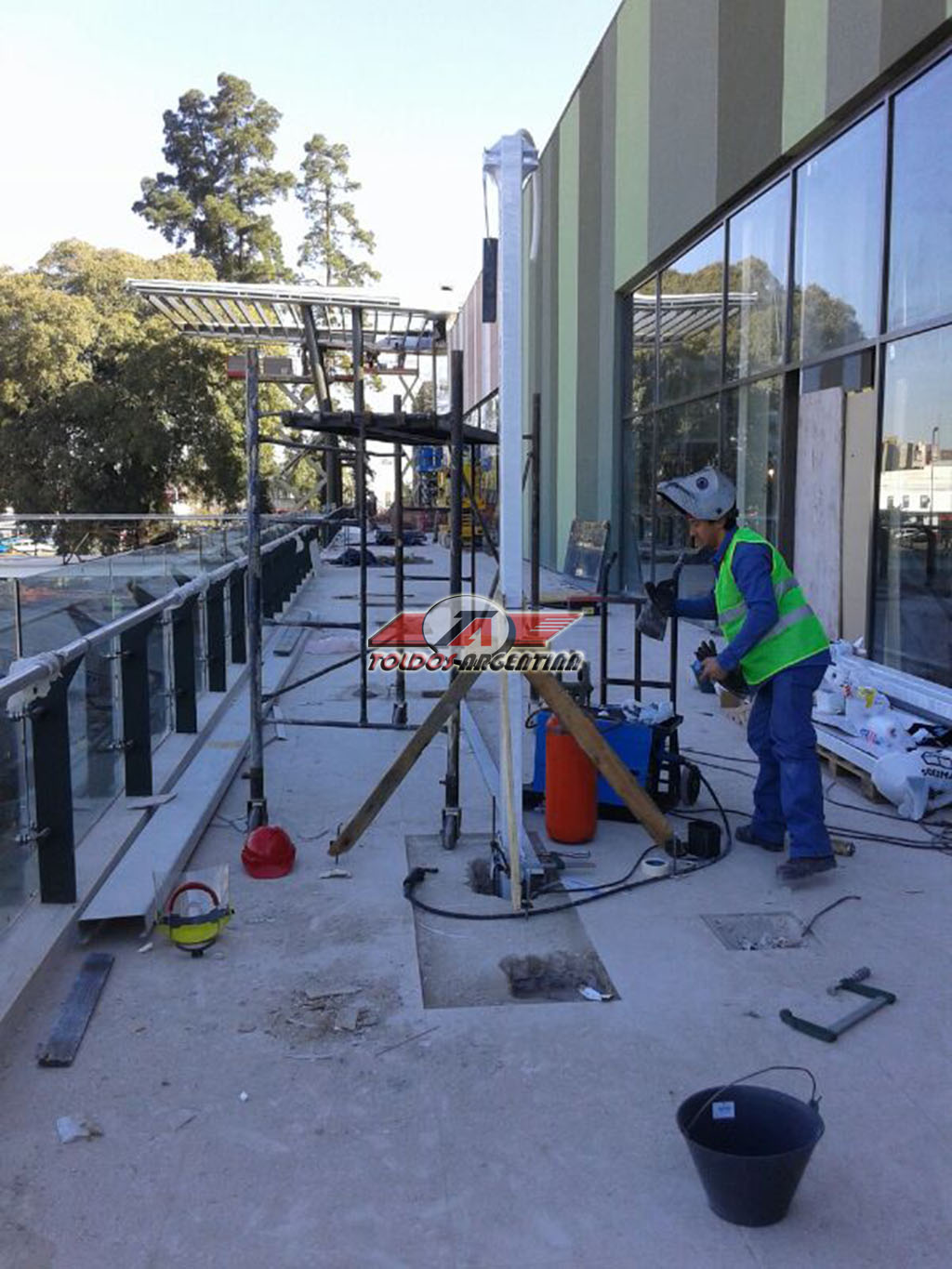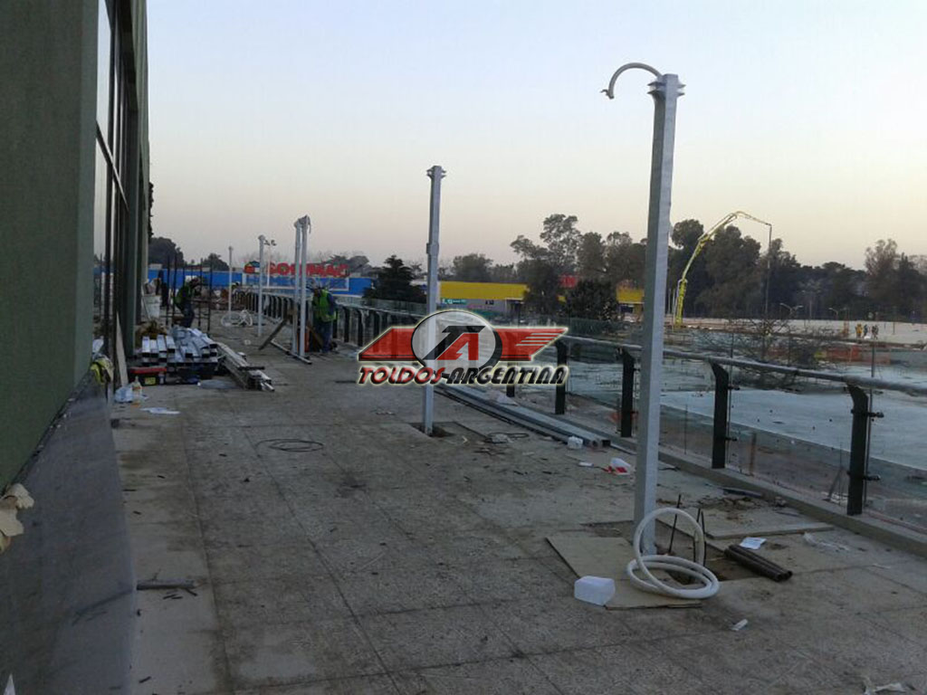 Se fabricarón 24 columnas para armar 7 islas con un total de 34 Toldos de brazos invisibles, generando un espacio de 333 mts2 para disfrutar de la terraza en el sector de patio de comidas.